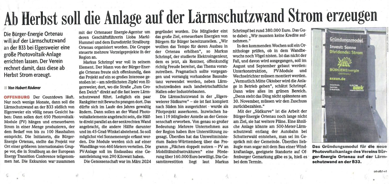 Startseite » Presse » Ab Herbst soll die Anlage an der Lärmschutzwand Strom erzeugenAb Herbst soll die Anlage an der Lärmschutzwand Strom erzeugenvon Markus Schrimpf3. Juli 202515. November 2025 Badische Zeitung , 2. Juli 2025