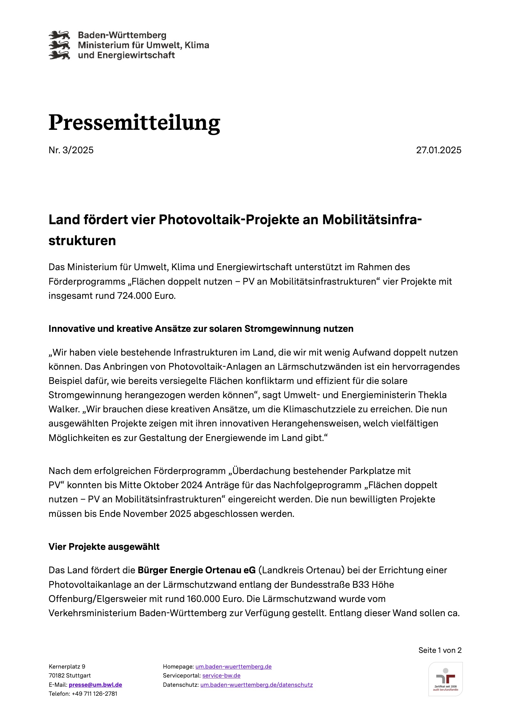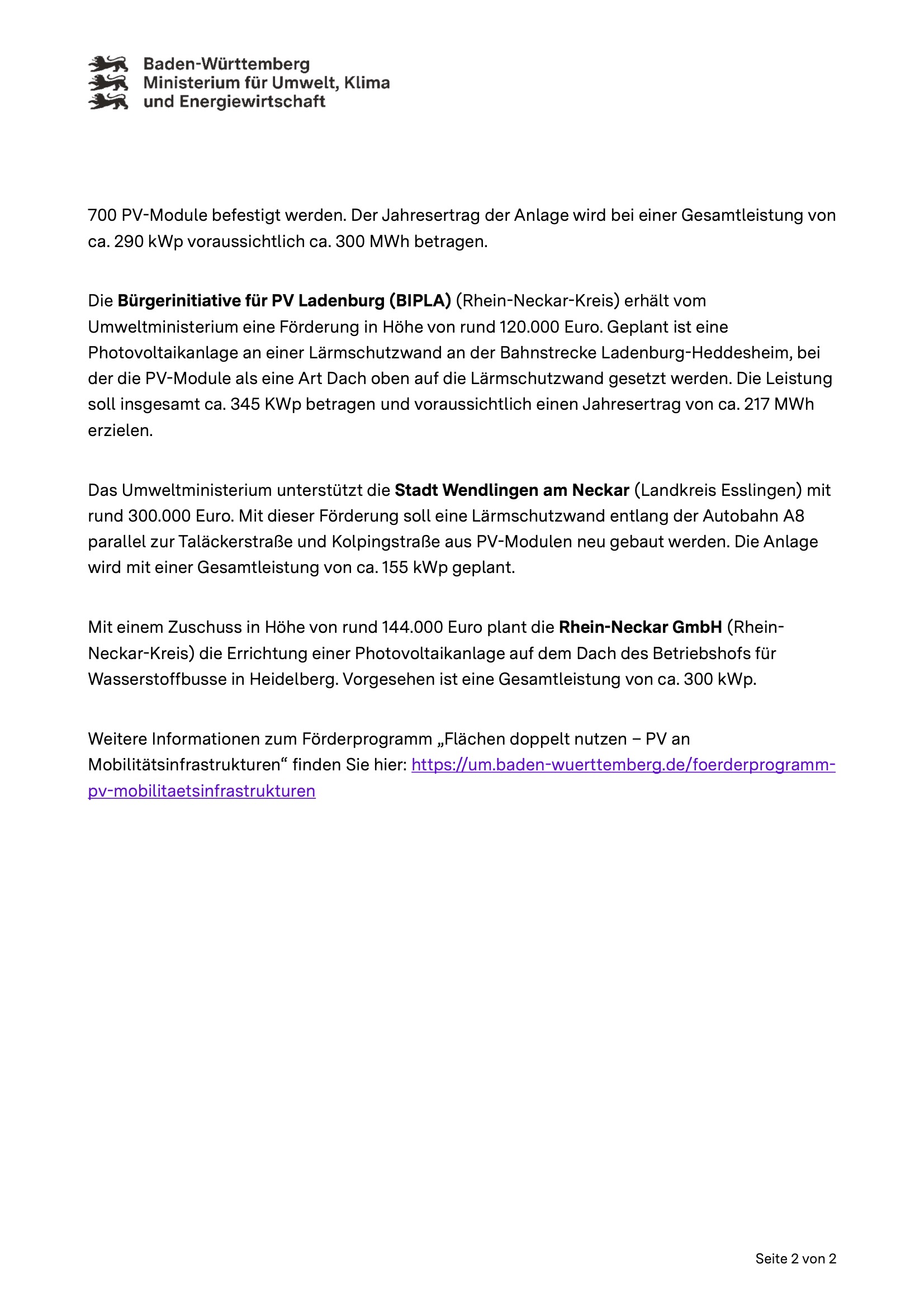 Startseite » Presse » Land fördert 4 PV-Projekte an MobilitätsinfrastrukturenLand fördert 4 PV-Projekte an Mobilitätsinfrastrukturenvon Markus Schrimpf31. Januar 202516. November 2025 Pressemitteilung, Baden Württemberg Ministerium für Umwelt, Klima und Energiewirtschaft, 27.01.2025