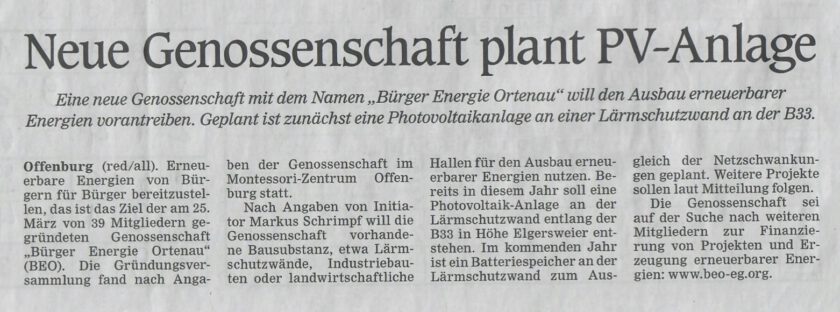 Startseite » Presse » Neue Genossenschaft plant PV-AnlageNeue Genossenschaft plant PV-Anlagevon Markus Schrimpf6. Mai 202416. November 2025 Offenburger Tageblatt, 06. April 2024