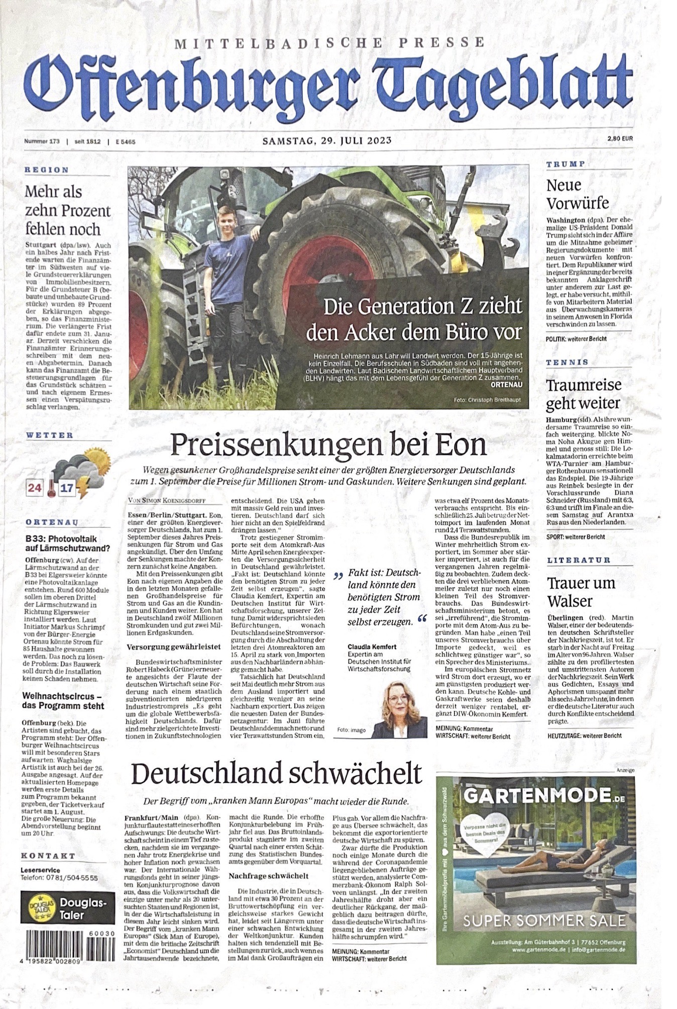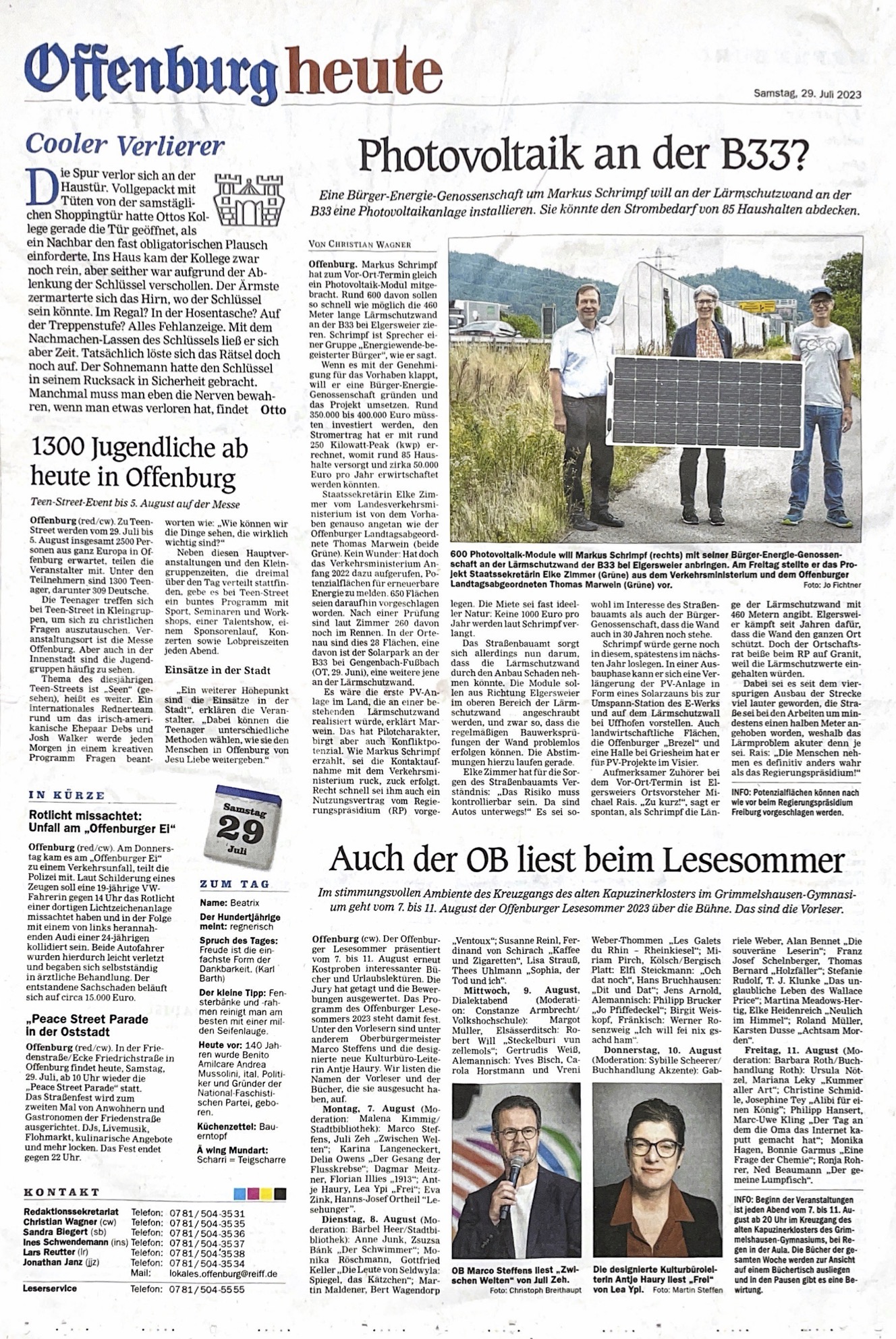Startseite » Presse » Photovoltaik an der B33?Photovoltaik an der B33?von Markus Schrimpf30. Juli 202316. November 2025 Offenburger Tageblatt, 29. Juli 2023, Titelseite und Seite „Offenburg heute“