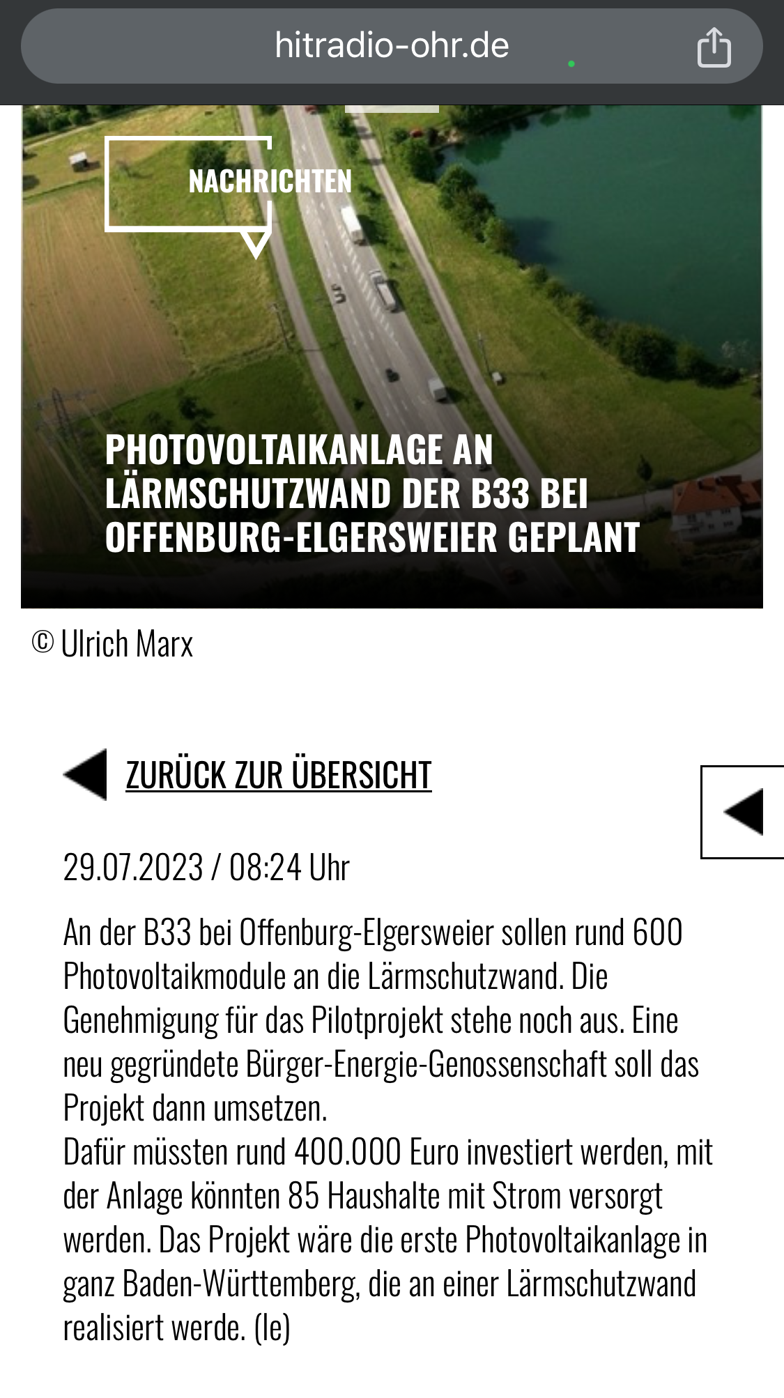 Startseite » Presse » Photovoltaikanlage an Lärmschutzwand der B33 bei Offenburg-Elgersweier geplantPhotovoltaikanlage an Lärmschutzwand der B33 bei Offenburg-Elgersweier geplantvon Markus Schrimpf28. Juli 202316. November 2025 Radio Ohr, 29.07.2023 / 08:24 Uhr