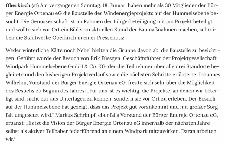 Startseite » Presse » Bürger Energie Ortenau besucht Baustelle Windpark HummelsebeneBürger Energie Ortenau besucht Baustelle Windpark Hummelsebenevon Markus Schrimpf25. Januar 202625. Januar 2026 Beitrag vom „Stadtanzeiger Ortenau“ vom 20. Januar 2026
